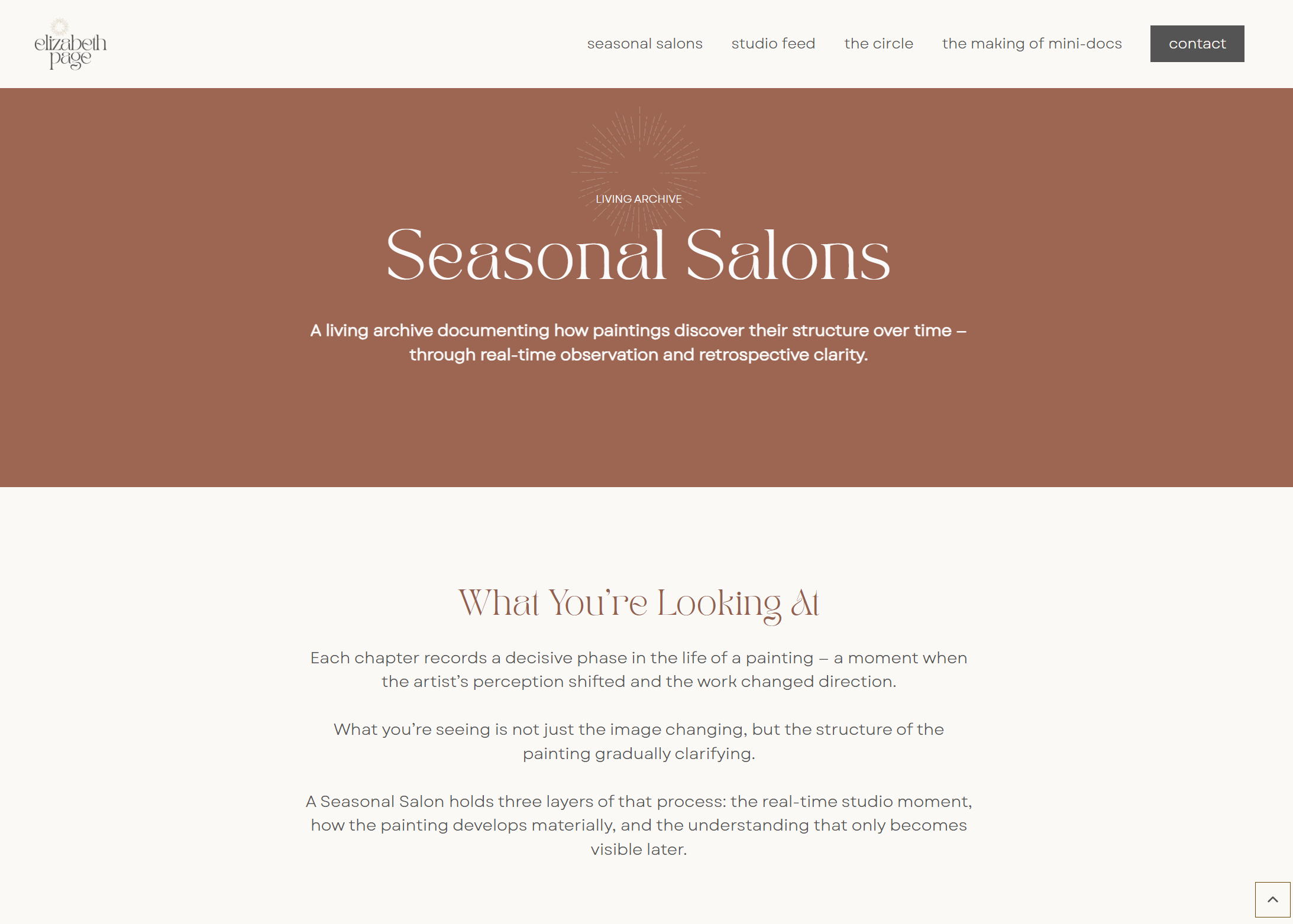 Artist Elizabeth Page wanted to create a digital space where collectors and followers could experience her work beyond finished paintings. The goal was to design member pages in Webflow that documents the evolution of her artwork through studio reflections, process imagery, and curated chapters.